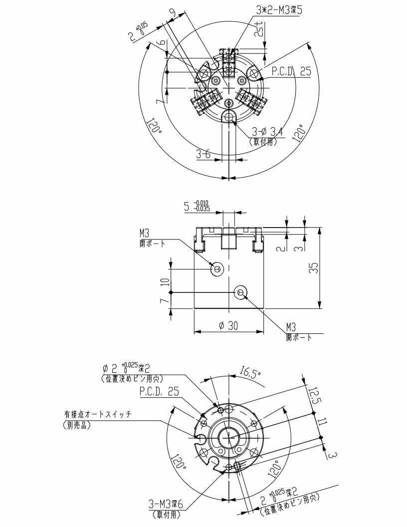 A low-profile, three-jaw parallel chuck with large opening and closing stroke.